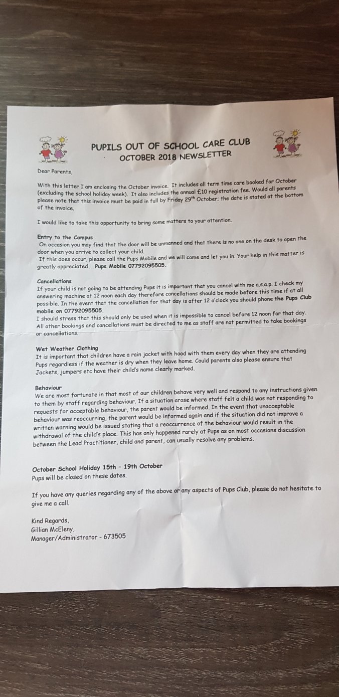 PUPS will be closed on Friday 16th and Monday 19th 2018 to coincide with the North Ayrshire School Holidays.